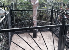 Могила стандартная, не большая. Когда-то здесь стоял гранитный памятник и была высокая ограда. После очередного захоронения плиту убрали в сторону, цветник тоже подняли, переднюю часть ограду демонтировали, установили временный крест.